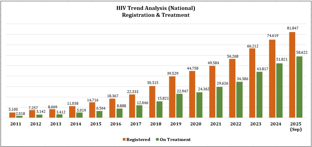 Year-wise trend showing number of patients registered with ART center & on ARV’s: